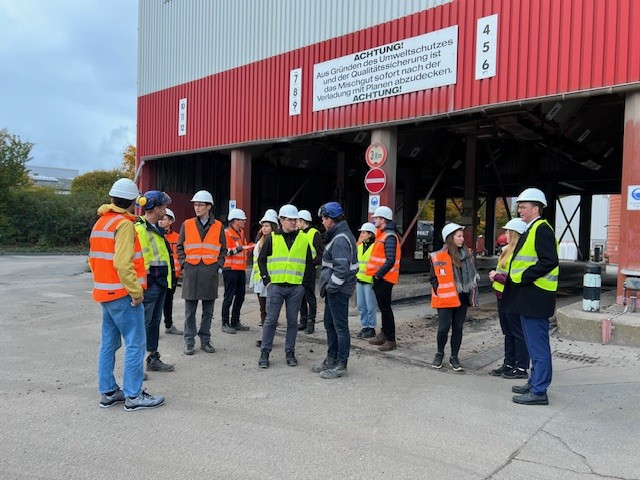 Es folgten dann eine Orientierung des Geländes, bevor wir dann geschützt und bestens ausgestattet über das große Terrain, das auch direkt an den breiten Bahngleisen im Bereich Altona liegt, gemeinsam gehen konnten. Betriebsleiter Karsten Schmidtke stellte uns die Rohstoffanlieferung, -aufbewahrung und Aufbereitung zur Produktion im Asphaltmischwerk vor. Begleitet wurden wir dabei auch von Hartwig Voß, Leiter der Maschinentechnik der Vereinigten Asphalt Mischwerke GmbH und CO KG
